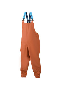 Regen tuinbroek met bretels van elastiek. Sluiting d.m.v. veiligheidsgesp. Elastiek in de rug. Elastiek in de beenpijpen.