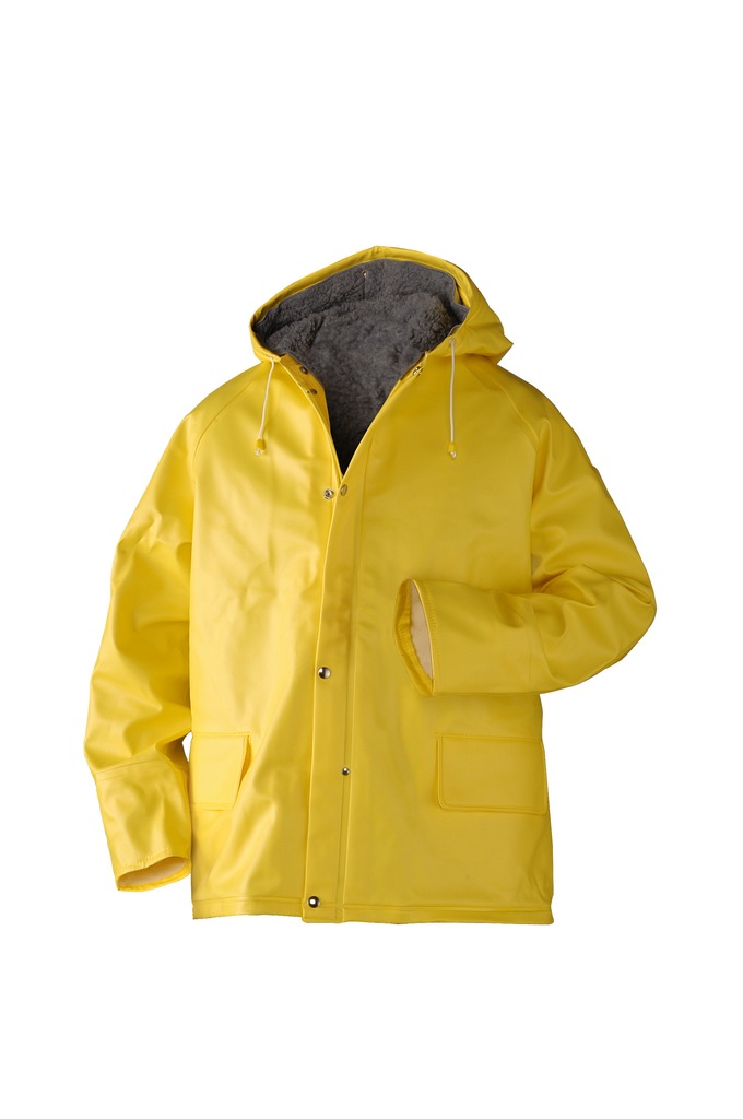 Capuchon met koord. Twee borstzakken met klep. Twee intasten. Elastiek in de rug. Verdekte ritsslsuiting met dubbele schuiver. Drukknopen op de verdekte sluiting, mouwen en de beenpijpen. Binnenzijde Polyester pluche drager.