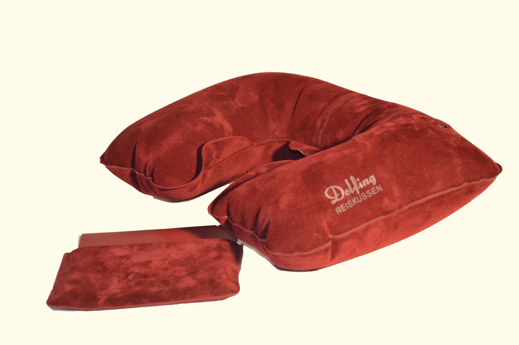 Eén van de eerste opblaasbare reiskussens die geproduceerd werden in Nederland voordat de massaproductie verplaatst werd naar Azië.